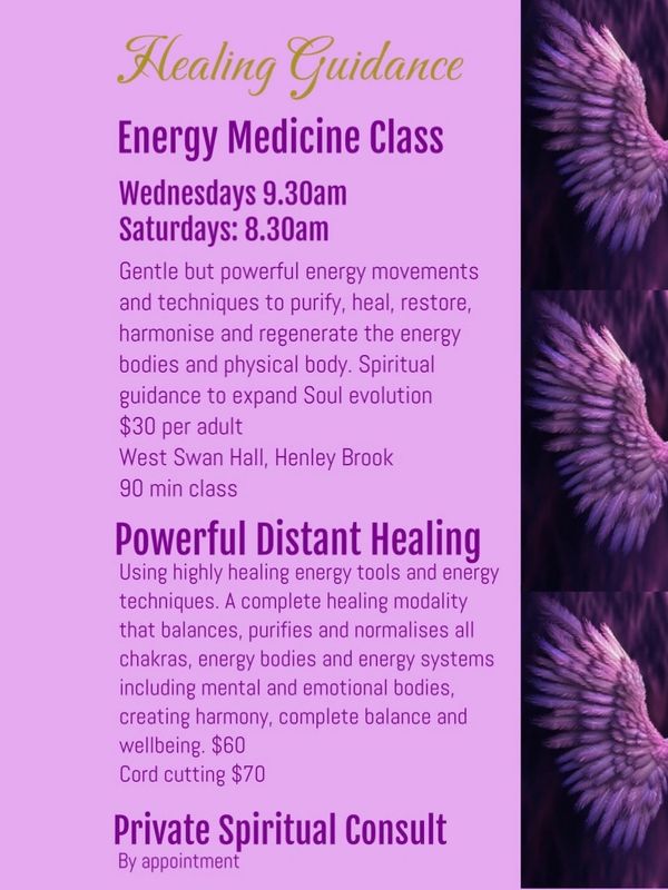 Energy Medicine Classes Wednesday 9.30am and Saturday 8.30am West Swan Hall, Swan Valley. No experience needed. $30 per class bookings essential. Powerful Distant Energy Healing on request